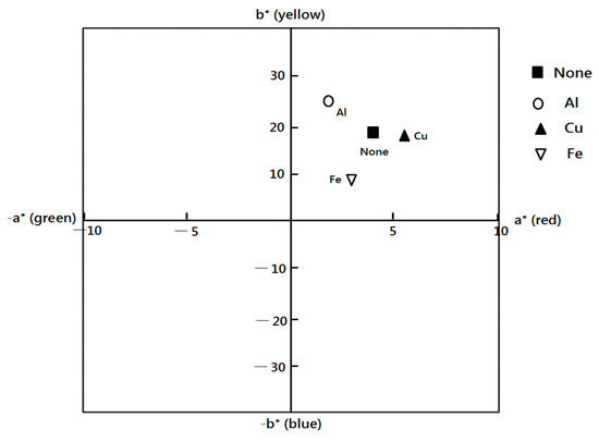 L* refers to lightness. The L* decreased after C. obtusa dyeing, particularly after the mordanting process. It was the lowest in the Fe-mordanted fabric. In general, the L* value has been reported to decrease in natural dyeing. The result of this experiment showed a reduction in L* similar to that seen in preceding studies []. Referring to the red/green coordinates, positive a* values are equivalent to redder shades, while negative values denote green (Figure 1); b* refers to the yellow/blue coordinates, wherein positive values are equivalent to yellow, while negative values denote blue. As regards the changes seen in the colors of fabrics after C. obtusa dyeing and mordanting, the a* and the b* values were all positive, suggesting reddish and yellowish colors. It is presumed that the reason for the change in color to reddish and yellowish is the tannin component of the C. obtusa leaves being dyed brown by ionic bonds []. The red value decreased while the yellow value increased in the A1-mordanted fabric, which showed a high dyeing affinity compared to the non-mordanted fabric. The red value increased while the yellow value decreased in the Cu-mordanted fabric compared to the non-mordanted fabric. Both the red and yellow values decreased in the Fe-mordanted fabric compared to the non-mordanted fabric.