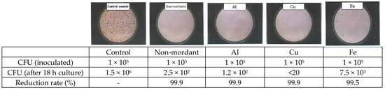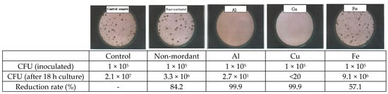 In order to measure the anti-superbacterial activity, superbacteria (MRSA ATCC 33591) were inoculated into the dyed fabrics. Bacteria were then immediately collected from the dyed fabrics (at 0 h after inoculation) and inoculated into a solid medium, before being measured for CFU. The results are as follows (Figure 4). On the control fabric, the presence of 15 ± 0.8 cfu/mL of superbacteria was measured. The presence of 4 ± 1.1 cfu/mL of superbacteria was measured on the non-mordanted fabric, indicating a 73.3% bacterial reduction rate. The presence of 4 ± 1.1 cfu/mL of superbacteria was measured on the AI-mordanted fabric, indicating a 73.3% bacterial reduction rate. The presence of 5 ± 1.2 cfu/mL of superbacteria measured on the Cu-mordanted fabric, indicating a 66.7% bacterial reduction rate. The presence of 3 ± 0.7 cfu/mL of superbacteria was measured on the Fe-mordanted fabric, indicating an 80% bacterial reduction rate. Growth of superbacteria was found to be significantly inhibited in the non-, AI-, and Fe-mordanted fabrics (p < 0.05) compared to the control fabric. Fe mordanting after dyeing yielded the highest antibacterial activity.