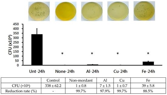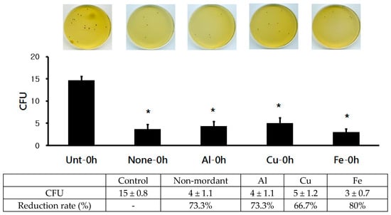 Anti-superbacterial (MRSA ATCC 33591) activity of cotton fabrics dyed with C. obtusa extracts with different mordants after 0 h incubation. Control: undyed control cotton fabric; non-mordant, without mordant; Al, aluminum sulfate mordant; Cu, copper sulfate mordant; Fe, ferrous sulfate mordant. Three replicates were made for each concentration of the test extract. * p < 0.05 was statistically significant as determined by independent sample t-test for the mean values different from the control group.