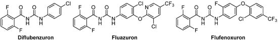 - Zhu, H.L.; Zhang, J.J.; Shi, J.; Xiong, L.X.; Huang, Z.Q. Design, synthesis, and insecticidal evaluation of new benzoylureas containing carbamate groups based on the bipartite model of sulfonylurea receptor binding site. Lett. Drug Des. Discov. 2023, 20, 110–118. [Google Scholar] [CrossRef]