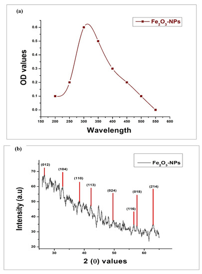 In the present study, Fe2O3-NPs were characterized in more detail using UV-Vis analysis, which can be utilized to learn essential details about Fe2O3-NPs’ sturdiness, size, and shape [32]. A clear and intense peak was observed at 350 nm, which corresponded to the presence of Fe2O3-NPs in the sample. Similar results were described in a previous study that reported the green synthesis of Fe2O3-NPs [4]. The crystalline structure of biogenic Fe2O3-NPs was evaluated using XRD analysis. Sharp diffraction peaks were observed at various index values ((012), (104), (110), (113), (024), (116), (018), and (214)), which revealed that the synthesized nanoparticles possessed extremely fine nature, a good crystalline rhombohedral structure, and a calculated size of 36.2 nm (a = b = 5.0346 Å, c = 13.7473 Å). This was in line with previous observations regarding nanoparticle crystal size [33]. Previous studies reported the similar crystal planes of (012), (104), (110), (113), (024), (116), (018), and (214) at similar 2θ values for Fe2O3-NPs that can be correlated with the current study [26,34].