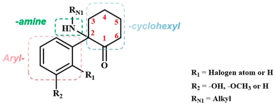 In recent years, new psychoactive substances (NPS) are continuing to emerge in the form of stand-alone compounds or mixtures and are gradually replacing traditional drugs as the dominant abuse drug in many countries [1]. Until 2021, the United Nations Office on Drugs and Crime (UNODC) has received reports from 133 countries and regions worldwide, documenting 1079 kinds of new psychoactive substances. Among these, ketamine is one of the most abused new psychoactive substances, reported by 93 countries and regions [2]. Ketamine is a representative substance of arylcyclohexanoneamine derivatives, which acts as an antagonist to the N-methyl-D-aspartate (NMDA) receptor in the human body [3]. Additionally, because of its effects on the central nervous system, which can cause hallucinations, dissociation, and euphoria, ketamine is one of the most widely abused hallucinogens [4,5]. With the increasing attention being paid to the abuse and addiction of ketamine by governments, ketamine is now classified as a strictly controlled substance in many countries worldwide. Recently, the abuse of a class of substances similar in structure and action to ketamine has become apparent [6]. The chemical structure of common ketamine analogues is exhibited in Scheme 1. In order to retain the antagonistic activity against the NAMD receptor, illegal elements mainly modify the substituents on the benzene ring and amino group of ketamine to obtain analogues [7,8]. In the last decade, ketamine analogues such as deschloroketamine (DCK), 2-fluoro-deschloroketamine (2F-DCk), etc., have continued to appear and are utilized for recreation purposes [9]. Moreover, these ketamine analogues all exhibit antagonistic effects on NMDA and achieve the same effects when they are abused recreationally [10].