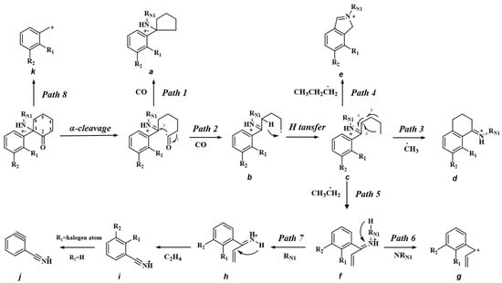 The following are the common EI-MS fragmentation patterns (as shown in Scheme 2) on the basis of the GC-Q-TOF/MS analysis of eight ketamine analogue reference substances [18]: (i) The nitrogen atom of ketamine analogues is initially ionized via EI. (ii) Second, the α-cleavage of the carbon bond C1-C2 in the cyclohexanone moiety stabilizes the positive charge on the nitrogen atom, followed by the neutral loss of a CO (28 Da) and a five-membered ring formed to generate the stable fragment a via the fragmentation pathway 1 or the neutral loss of a CO (28 Da) to generate the unstable fragment b via the fragmentation pathway 2. (iii) The unstable fragment b is prone to causing hydrogen transfers to generate the fragment c, leading to the radical approach to the positive nitrogen atom. (iv) Subsequently, fragment c loses a methyl radical (15 Da) and undergoes rearrangement to form a six-member ring to yield the fragment d via the fragmentation pathway 3. (v) Also, fragment c loses a propyl radical (43 Da) and undergoes rearrangement to form a five-member ring to generate the fragment e through the fragmentation pathway 4. (vi) The fragment f is generated by the loss of an ethyl radical (29 Da) from the fragment c based on the fragmentation pathway 5. (vii) The fragment f can further fragment into the ion g by losing an NRN1 according to the fragmentation pathway 6. NRN1 is often made of CH3N (29 Da), C2H5N (43 Da) and C3H7N (57 Da). (viii) Another fragmentation pathway of the fragment f yields the fragment h by loss of an RN1 (RN1 is usually composed of CH2 (14 Da), C2H4 (28 Da) and C3H6 (42 Da)) via the fragmentation pathway 7, further yielding the fragment i by the loss of a C2H4 (28 Da). (ix) When R1 and R2 are halogen and hydrogen atoms, respectively, fragment i can continue to lose halogenated hydrogen (HF (20 Da), HCl (36.5 Da), HBr (80 Da)) to yield the fragment j (m/z 104). (x). Ketamine analogues yield the fragment k by the cleavage of the carbon bond via the fragmentation pathway 8.