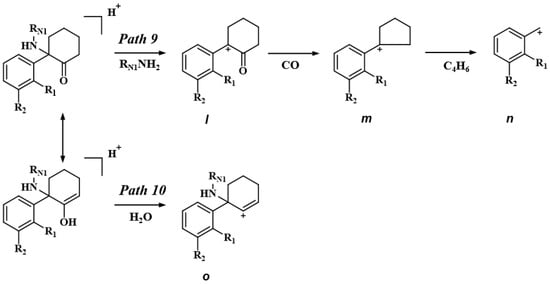 The following are the common fragmentation patterns of ESI-MS/MS (illustrated in Scheme 3) according to a LC-Q-Orbitrap/MS analysis of eight ketamine analogue reference substances. (i) Ketamine analogues easily yield the characteristic fragments l and m by the loss of an RN1NH2 (RN1NH2 usually consists of CH3NH2 (31 Da), CH3CH2NH2 (49 Da) and CH3CH2CH2NH2 (42 Da)) and a CO (28 Da) through the fragmentation pathway 9 and further fragment into the fragment n by hydrogen transfer and the cleavage of the carbon bond. (ii) Another fragmentation pathway of ketamine analogues yields the fragment o by the loss of H2O (18 Da) via the fragmentation pathway 10.