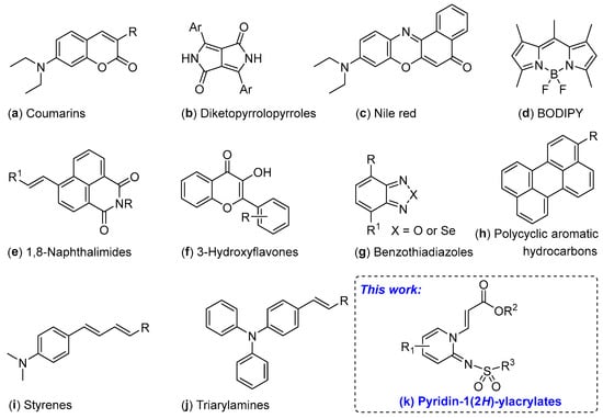 Luminescent materials have attracted intense interest owing to their applications in, for example, light-emitting diodes (LEDs), solar cells and laser dyes, as well as their use as photosensitizers, biomolecular labels and molecular probes [1,2,3,4,5,6]. More particularly, organic materials have been widely exploited for their electroluminescence properties because of their simple molecular structures, often ready accessibility and their excellent optical and electrical properties [7], as evidenced by their exploitation in solid lasers [8], field-effect transistors [9], fluorescence probes and biomarkers [10,11,12,13]. Examples of compounds that have been of great value in developing detailed understandings of photophysical processes [14,15,16] are, as shown in Figure 1, coumarin derivatives (a) [17,18], diketopyrrolopyrroles (b) [19], Nile red-type dyes (c) [20], BODIPYs (d) [21,22], 1,8-naphthalimides (e) [23,24], 3-hydroxyflavones (f) [25], benzothiadiazoles (g) [26,27], polycyclic aromatic hydrocarbons (h) [28], styrenes (i) [29,30,31] and triarylamines (j) [32,33,34,35,36,37,38]. Although these compounds display good luminous properties, the often-multi-ring structures and attendant structural rigidities together with the complexities of their synthesis and modification can detract from their use. As such, it remains important to identify and prepare new organic fluorescent materials possessing distinctive structural features and photoelectric properties.