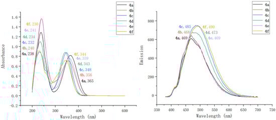 UV–vis absorption (left) and fluorescence (right) spectra of compounds 4a–4f (spectra recorded in MeOH).