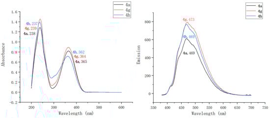 UV–vis absorption (left) and fluorescence (right) spectra of compounds 4a, 4g–4h (spectra recorded in MeOH).