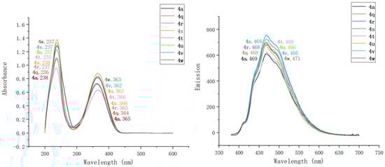 Investigations of the photophysical properties of products 4a–w involved the recording of their UV–vis absorption and fluorescence spectra and using methanol as solvent. The outcomes of such studies are shown in Table 2 and Figure 3, Figure 4, Figure 5 and Figure 6.