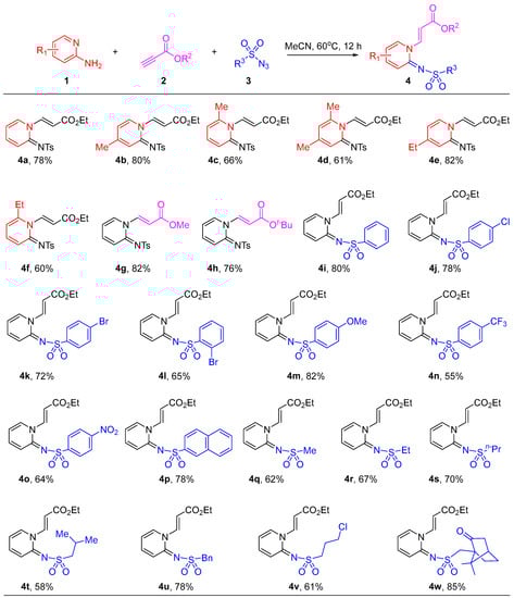Informed by earlier studies [49,50], our present investigations began with efforts to prepare ethyl (E)-3-((E)-2-(tosylimino)pyridin-1(2H)-yl)acrylate (4a) via coupling of 2-aminopyridine (1a,), ethyl propiolate (2a) and p-tosyl azide (3a)—see Table 1. The initial reactions were carried out at 60 °C in the presence of ferrocene [Fe(C5H5)2] and using DCE as solvent. After 12 h, and following chromatographic purification, target 4a was obtained in a 68% yield (Table 1, Entry 1). In efforts to improve this outcome, various other catalysts were screened and so revealed that both ferrous- and ferric-based-catalysts were effective (Table 1, Entries 2−4) while Pd-, Rh- and Cu-based ones were not (Table 1, Entries 5–7). Surprisingly, the reaction giving the highest yield of the desired product involved no catalyst at all (Table 1, Entry 8). While comparable yields were obtained using toluene, CH2Cl2, DCE, THF, 1,4-dioxane, DMSO or DMF as solvents, employing MeCN as the reaction medium gave target 4a in the highest yield (78%) (Table 1, Entries 9–15). Monitoring the reaction by TLC revealed that it was complete in less than 12 h at 60 °C (Table 1, Entries 16–23).