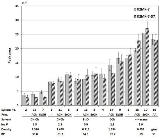 As can be seen from the data presented in Figure 1, the individual systems are characterized by different isolation efficiencies of the vitamin K2MK-7 standard and its deuterated derivative. The change in the extraction solvent type differentiates clearly the size of the surface area of both compounds (Fcal = 48.45, Ftab = 3.48, see Table 1). In general, the smallest peak areas were observed in the extracts obtained with CH2Cl2 and the largest with n-hexane. At the first glance, it might seem that the observed differences are the result of different affinities of individual solvents for the analyte. However, the problem is more complex.