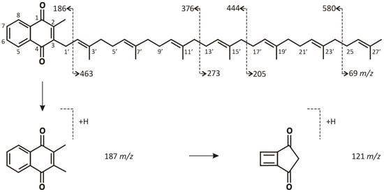 Chemical structure and a characteristic fragmentation pattern of K2MK-7 together with the chemical structure of the product ions used for the analysis.