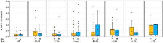 The graphical representation of the obtained data is shown in Figure 4 in the form of box plots with the division into the sex- and age-related groups. Their analysis allows us to conclude that, in line with the expectations, the content of vitamin K in the Polish society is generally small. However, as can be seen in the studied age groups for individual genders, the obtained field ranges, their position, median values (marked as the line across the box), and average values (marked with the cross) are different. These features independently confirm the applicability of the developed method for the routine analysis of vitamin K2MK-7 content in the serum samples.