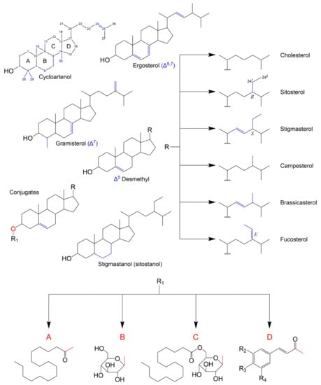 Based on biosynthetic origins and specific stereochemistry, a sterol can be defined as a chiral tetracyclic isoprenoid which is normally formed by cyclization of squalene oxide through the transition state possessing stereochemistry similar to the trans-syn-trans-anti-trans-anti configuration and retains a polar group at C-3 (hydroxyl or keto), an all-trans-anti stereochemistry in the ring-system and a side chain 20R-configuration [42] (pp. 1–40). As a consensus, sterols are differentiated by variations within the cyclopentanoperhydrophenanthrene ring system and/or sidechain modifications, being the carbon numbering and some PS examples presented in Figure 1. In terms of structural and biosynthetic grounds, PS are divided into: 4,4-dimethylsterols (e.g., lanosterol), which retain both methyl groups at C-4; the 4α-(mono)methylsterols (e.g., gramisterol), which retain a methyl group at the C-4α position; and the 4-desmethyl (e.g., sitosterol), from which both methyl groups at C-4 have been removed. Both 4-dimethyl and 4α-methylsterols are precursors of 4-desmethylsterols and exist at lower concentrations. The latter are also categorized into Δ5-sterols, Δ7-sterols and Δ5,7-sterols according to the position and number of double bonds in the B ring. Lastly fully saturated counterparts of sterols are named stanols (e.g., sitostanol). Another distinction is made according to side chain alkylation at the C24 position, which will also reflect on the total number of carbons in the molecule. As such, sterols can also be classified as 24-desmethylsterols, 24-methylsterols and 24-ethylsterols. It is also of importance that the introduction of an alkyl group at C24 generates a new chiral centre and thus C-24 epimeric pairs can occur (e.g., campesterol/22-dihydrobrassicasterol, crinosterol/bassicasterol, sitosterol/clionasterol, and stigmasterol/poriferasterol) [43]. In PS, 24α(24R)-methyl (e.g., campesterol) or 24α(24R)-ethyl (e.g., sitosterol) substituents are the most common (apart from stigmasterol, which has 24β(24S) configuration due to its C22=C23), whilst 24β(S)-ethyl and 24β(S)-methyl are the most common in algae and fungi, respectively [44].