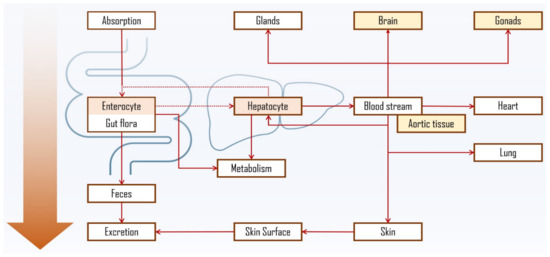 In fact, PS liver metabolism and enzymatic oxidation were confirmed in earlier studies [154,155] with bile acids found in human plasma and bile after intravenous injection of labelled sitosterol, which converted into the same primary structures as cholesterol, i.e., cholic and chenodeoxycholic acid [156]; non-conventional bile acids (e.g., acidic metabolites) were also observed [142,156,157]. Most of the sitosterol was found to be rapidly secreted into the bile in its free form, thus leading to mainly faecal excretion, which was also confirmed for other common PS [158]. PS biliary secretion rate in male volunteers was shown to support the inverse relationship between hepatic clearance and intestinal absorption, with sitosterol’s being quicker (1.23 mg/h) when compared to campesterol (0.76 mg/h) [159]. It is worth mentioning that in situ biohydrogenation of sterols to stanols and/or stanones in human digestive tract, analogous to well-known transformation of cholesterol to coprostanol, should also be considered [160]. In fact, PS and their corresponding stanols were found in faecal samples of healthy individuals [161]. Figure 6 depicts the proposed PS distribution via oral ingestion, including PS accumulation in intestinal epithelia, liver, aortic tissue, adrenal glands, brain and skin [162,163]. The latter has also been proposed not only as another route for PS absorption [164] and elimination [165], but also as OPS formation site in healthy subjects via oxidation catalysed by UV light of PS absorbed from cosmetic products.