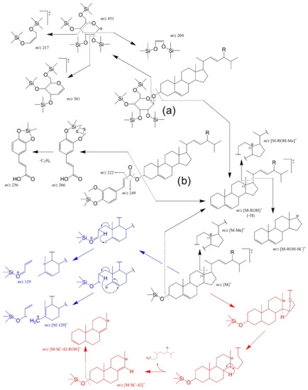The origins of principal fragments in EI-MS spectra for the most common Δ5 free and conjugated sterols, where R-H: cholesterol, R-CH3: campesterol, R-CH3 with C22=C23: brassicasterol, R-CH2CH3: sitosterol, and R-CH2CH3 with C22=C23: stigmasterol. Characteristic fragmentation for the free Δ5-PS and corresponding saturated counterparts are marked in blue and red, respectively. In the example of the (a) tetra-TMS-steryl-3-β-d-glucopyranoside, being the cleavage of the steryl bond normally accompanied by a charge retention on the sterol moiety leading to m/z [M – ROH + H]+ [247]. The same trend can be observed for (b) TMS-steryl ferrulate example [248]. EI-MS of SG TMS ether normally gives a very weak m/z [M]+ and the spectra is dominated by ions from the hexose TMS ether moiety (m/z 451, 361, 217, 204 in the example) [250].