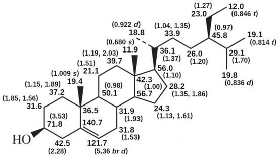The 1H NMR spectrum of a compound provides structural information directly from the presence of specific signals and their relative intensities, while 13C NMR spectroscopy offers great sensitivity of chemical shifts to structural changes and the possibility to examine each carbon atom in the molecule individually (Figure 10). Given the variety of PS in natural sources, which differ from one another merely by the presence or absence of unsaturated bonds and alkyl substituents and their locations in the side chain at C-17 position, NMR is perhaps one of the most powerful means for their structural identification (e.g., sitosterol NMR profile in Figure 10). It is also convenient to have several sources of compiled information on NMR data for sterols that can be compared to standards and samples [42] (pp. 197–253).