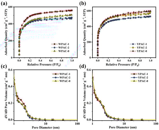 Figure 2 shows the N2 adsorption–desorption curves and pore size distribution of the samples. The N2 adsorption–desorption isotherms of WPAC-1 and YPAC-1 are observed in Figure 2a,b were consistent with type I isotherms (IUPAC classification criteria), which indicates that they were dominated by narrow micropores (<1 nm) []. However, the N2 adsorption–desorption curves for WPAC-2, WPAC-0, YPAC-2, and YPAC-0 exhibited adsorption hysteresis loops, which is a characteristic feature of type IV isotherms; this result indicates the coexistence of micropores and mesopores []. Additionally, under high pressure conditions (0.95 < P/P0 < 1.0), the N2 adsorption–desorption isotherm shows a slight increase, indicating the presence of a small number of macropores in the material []. Secondly, the pore size distribution of the samples was calculated in accordance with the N2 adsorption–desorption isotherm using NLDFT (Figure 2c,d). The pore sizes of all samples were mainly distributed between 0 and 10 nm, which showed that all carbon materials were rich in micropores (<2 nm) and mesopores (2–50 nm). The specific surface area and pore parameters of different samples are shown in Table 1. It is not difficult to observe that the specific surface areas of all samples are within the range of 1400–1700 m2 g−1, and the percentage of micropores ranges from 41% to 54%. This is mainly due to the consistent activation conditions of all samples, resulting in similar specific surface areas and proportions of micropores. In summary, these samples possess excellent pore structures, which is beneficial for the enhancement of electrochemical performance. Micropores inside have multiple twisted and narrow channels, which can shorten the diffusion path of ions in electrode materials and increase the migration rate of ions in the electrode. Mesopores can allow ions and solutions to rapidly permeate the surface of the electrode []. A small number of macropores could reduce the resistance to electrolyte transfer and facilitate ion or reactant diffusion [,].