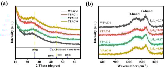 (a) XRD pattern and (b) Raman spectra of WPAC-1, YPAC-0, YPAC-1, and YPAC-2.