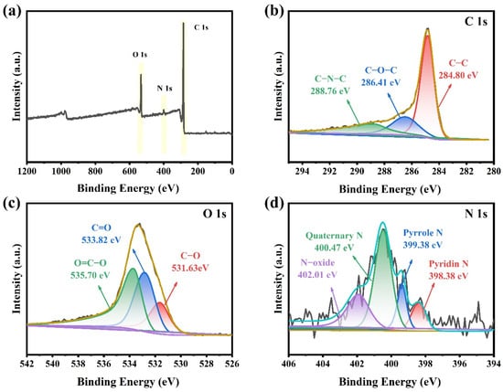 (a) XPS full spectrum and (b–d) C 1s, O 1s, and N 1s high-resolution spectra of YPAC-1.