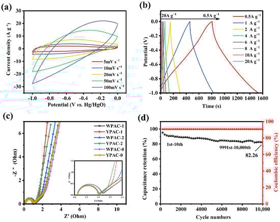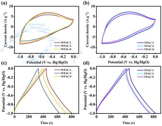 In a three-electrode system, nitrogen-doped porous carbon based on egg yolk/white was tested for supercapacitor performance using a 6 M KOH electrolyte. The CV curves obtained at a scan rate of 20 mV s−1 for the egg yolk/white nitrogen-doped porous carbon electrodes are shown in Figure 5a,b. Weak humps were observed in the current range of −0.3 V to −0.7 V due to Faraday reactions generated by pyrrole N and pyridine N. Pyrrole N provided additional reversible pseudocapacitance, which gave the electrode excellent electrochemical performance. The constant current charge–discharge curves of the nitrogen-doped porous carbon prepared based on egg yolk/white were triangular (Figure 5c,d), but the GCD curves were not strictly symmetric due to the presence of pseudocapacitance []. YPAC-1 had the longest discharge time and the highest specific capacitance among all samples. As described in the previous section on pore characteristics and XPS analysis results, the combination of high specific surface area enhancing the viability of the charge accumulation surface, multilevel pore structure accelerating ion transport and diffusion, and N doping changing the characteristics of carbon electron donor/acceptor were the main factors affecting the performance of the nitrogen-doped porous carbon supercapacitors based on egg yolk/white [].