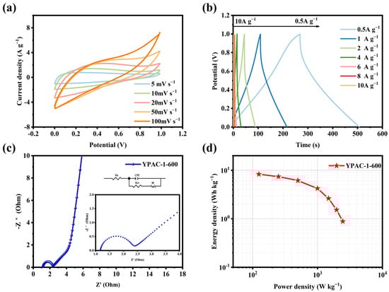 Electrochemical performance of YPAC-1-600 based supercapacitor tested in a two-electrode configuration in an aqueous electrolyte of 6 M KOH. (a) CV curve (5–100 mV s−1). (b) GCD curve (1–10 A g−1). (c) Impedance profile. (d) Ragone plot.