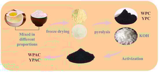 The preparation process of in situ nitrogen-doped carbon-based materials based on egg yolk/white and waste rice is shown in Figure 8. The egg yolk/white and waste rice powder were mixed in a beaker with mass ratios of 1:1, 1:1.5, and 1:0. Then, they were placed in a holding tank with liquid nitrogen for rapid freezing. Thereafter, they were transferred to a freeze dryer after complete freezing and kept for 72 h to obtain the egg yolk/white precursor. The egg yolk/white precursors were added to corundum boats and heated up to 600 °C in a tube furnace at 2 °C min−1 under a nitrogen atmosphere and maintained for 2 h. Next, the solid products were washed three times each with anhydrous ethanol and deionized water, and they were dried overnight in a vacuum drying oven at 80 °C. This process produced pre-carbonized egg white biochars, which were labeled as WPC-1, WPC-2, and WPC-0, and egg yolk biochars, which were designated as YPC-1, YPC-2, and YPC-0. The abovementioned biochar and KOH were weighed at a mass ratio of 1:4 and ground in an agate mortar. The ground mixture was added to a nickel crucible, followed by pyrolytic activation in a tube furnace under a nitrogen atmosphere (N2 flow rate of 25 mL min−1). The temperature was increased to 600 °C at a rate of 2 °C min−1 and maintained for 2 h. After cooling to room temperature, the obtained samples were washed three times with 10 wt% HCl and finally washed with deionized water to neutralize. The solid products were dried overnight in a vacuum drying oven at 80 °C. The resulting nitrogen-doped porous carbon samples derived from egg white were named WPAC-1, WPAC-2, and WPAC-0, and those derived from egg yolk were named YPAC-1, YPAC-2, and YPAC-0.