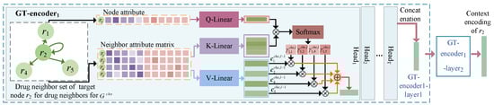 The target node attributes are contextually linked to the attributes of the neighbors of each category in their neighborhood. In order to learn the context representations of the nodes, we designed the CET module based on a graph-level attention mechanism to aggregate information regarding its neighbor nodes. As each heterogeneous graph has a unique topology, we used a graph transformer (GT) module (Figure 2) for and . The semantic information of the similarity or association connection edges between the neighbor node and target node was used to learn the corresponding neighborhood context representation. The module comprised coding levels; layer l can serve as an illustration of how the context is learned. The CET module’s drug node and side-effect node learning processes were similar; an example is described for drug .