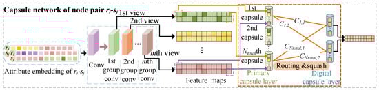 We encapsulated the value of the p-th position on the w feature maps , , …, into a capsule to form . This capsule contained information regarding multiple views in the local area when the filter was slid into the p-th position of the feature map .The primary capsule layer contained capsules of w-dimensional vectors.