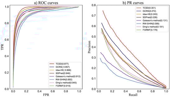 For each drug, we calculated the corresponding AUC and AUPR in each multiple and then took the average value for the five-fold crossover as the final prediction result. The average values of the AUC and AUPR for 708 drugs were taken as the prediction performance of the entire method. As shown in Figure 4, TCSD obtained the highest AUC of 0.977, i.e., 0.9% and 2.0%, respectively, higher than idse-HE and GCRS, 3.1% and 3.2% better than SDPred and Ding’s method, respectively, 5.8% higher than FGRMF, 6.5% better than Galeaon’s method, and 8.5% higher than RW-SHIN, the worst-performing method. For the mean AUPR of all drugs, TCSD obtained the best mean AUPR value of 0.351, i.e., 7.9%, 12.5%, 16.0%, 17.2%, 22.0%, and 25.2% higher than the values from the above methods, respectively.