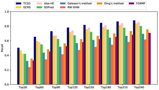 For the top k drug candidates with side-effects, a higher recall indicates that more real drug and side-effect associations are included in these candidates. Our TCSD model consistently outperformed other methods at different k thresholds and ranked 50.3% of the positive cases in the top 30 candidates, 65.4% in the top 60, 73.0% in the top 90, and 78.1% in the top 120. GCRS has higher recall rates than idse-HE for the top 30 and 60 candidates. The former ranked 47.0% and 59.6% positive samples, while the latter ranked 42.1% and 58.1%, respectively. Idse-HE achieved slightly higher recall rates than GCRS for the top 90, 120, and 240 candidates. Idse-HE ranked 67.1% and 73.9% for the top 90 and 120 candidates, while GCRS ranked 66.8% and 71.9% (Figure 5). The AUC value of GCRS was very close to that of SDPred, but all of the recall rates of GCRS were higher than those of SDPred. When k was increased from 30 to 120, the SDPred ranked 41.8%, 54.9%, 62.3% and 67.4%, respectively. Ding’s method was not as good as SDPred, with corresponding recall rates of 35.5%, 48.2%, 56.3%, and 62.2%, respectively. The recall rates of FGRMF (32.8%, 45.2%, 52.5%, 58.1%) were slightly higher than those of Galeaon’s method (32.3%, 43.6%, 51.7%, 56.8%). The lowest recall rates were obtained by the RW-SHIN method with recall rates of 23.7%, 34.3%, 41.3% and 47.2%, respectively.