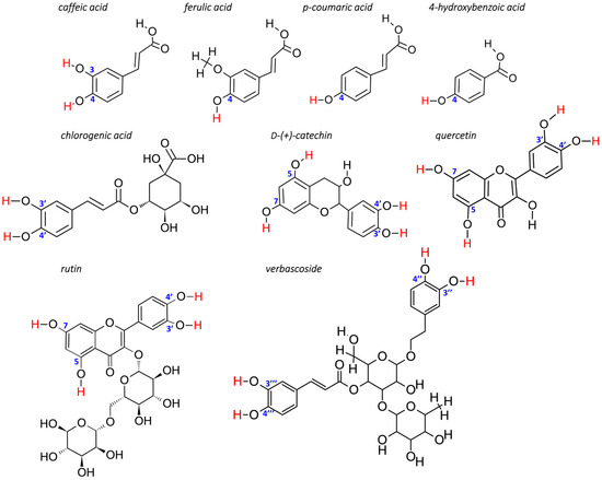Schematic representation of molecules is shown in Figure 1. Phytochemicals belonged to different classes of molecules, such as phenolic compounds (caffeic acid, coumaric acid, chlorogenic acid, ferulic acid), flavonoids (catechin and rutin) and phenylpropanoid (verbascoside).