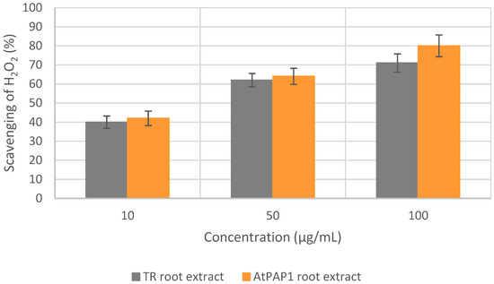 The hydrogen peroxide scavenging activity of TR and AtPAP1 root extracts was determined using the H2O2 assay [48] with slight modifications. Briefly, 2 mL of extract solution (10, 50 and 100 µg/mL) in methanol was added to 4.0 mL of H2O2 (20 mM) solution in phosphate buffer (pH 7.4). The reaction mixture was allowed to incubate for a duration of 10 min, after which the absorbance of the mixture was determined at 230 nm using a Shimadzu UV-1700 UV/VIS spectrophotometer (Tokyo, Japan), with a phosphate buffer blank solution serving as the reference. Ascorbic acid was used as a positive control. The percentage scavenging of H2O2 was calculated using Equation (1):