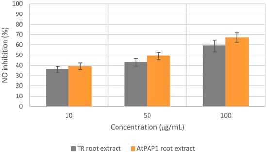 In the NO scavenging assay, the IC50 values of the TR and AtPAP1 L. sibiricus L. root extracts were determined to be 68.8 and 48.0 µg/mL, respectively. As a reference, the standard ascorbic acid demonstrated an IC50 value of 18.7 µg/mL. The dose-dependent scavenging effect of the L. sibiricus L. extracts on nitric oxide is illustrated in Figure 3.