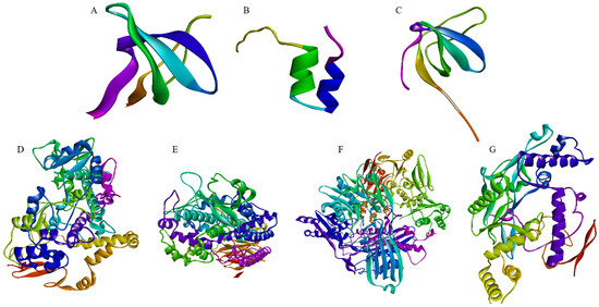 The target proteins: NOX p40phox (A), NOX p47phox (B), NOX p67phox (C), COX-2 (D), 5-LOX (E) iNOS (F) and XO (G) (Protein DataBank, www.rcsb.org, accessed on 20 May 2023).