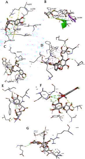 Compounds identified in L. sibiricus L. root extracts dock into targeted proteins with the lowest energy: (A): NOX p40phox with chlorogenic acid; (B): NOX p47phox with chlorogenic acid; (C): NOX p67phox with verbascoside; (D): COX-2 with rutin; (E): 5-LOX with chlorogenic acid; (F): iNOS with rutin; (G): XO with rutin.