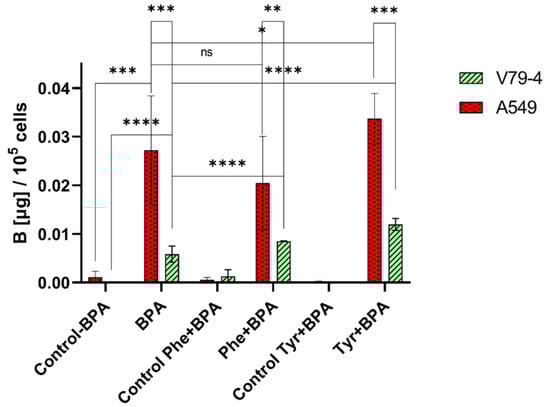 Figure 1. Boron accumulation in A549 and V79-4 cells after exposure to BPA and the influence of preloading with L-phenylalanine (Phe) and L-tyrosine (Tyr) on BPA uptake. Boron concentration is expressed as B [µg]/105 cells. Data are given as mean ± SD from three independent experiments. Significance level symbols represent the results of unpaired t-tests between the studied variants: ns (not significant, p > 0.05), * (p  ≤  0.05), ** (p  ≤  0.01), *** (p  ≤  0.001), and **** (p  ≤  0.0001).