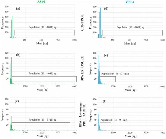 The most distinct observation during the analysis of histograms is the clear diversity in each sample, which corresponds with the genetic heterogeneity of cells, especially in the cancerous cell line. It has been established that cell lines originating from cancer tissues are subjected to transformations such as multiplication, mutation, and chromosomal rearrangement, resulting in the phenotypical and morphological variability within isolated cell lines [44]. That is the case of the nonhomogeneous A549 cell line, which consists of multiple clones [37], as reflected in the presented histograms that show a different cellular response to BPA within the tested population. The results further indicate that even though there is a notable difference in the uptake of BPA in A549 cells compared to V79-4 cells, as described in Section 2.1, only a part of the whole population of cells responds to BPA exposure, and the response varies. After the initial common peak for all samples, there is a visible difference between them after the threshold of 101 ag. Hence this value was chosen as a baseline to compare the separated population of cells, and the results for this highlighted population are summarized in Table 1.