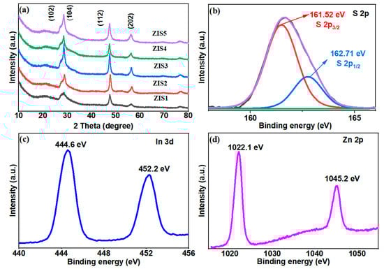 (a) XRD patterns of ZIS samples and high-resolution XPS spectra of (b) S 2p, (c) In 3d, (d) Zn 2p of ZIS4.