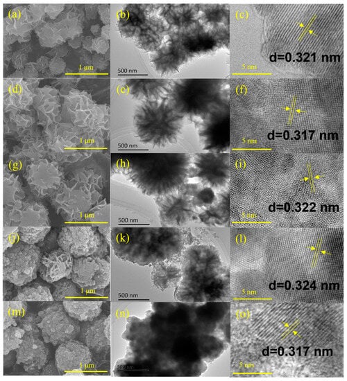 Figure 2 displays the morphology and structure of prepared ZnmIn2S3+m photocatalysts. The scanning electron microscopy (SEM) images (Figure 2a,d,g) show clearly that the ZnIn2S4, Zn2In2S5, and Zn3In2S6 samples were composed of cross-linked nanosheets and the average diameter of the microspheres was about 1 μm. Interestingly, the shapes of microspheres for Zn4In2S7 and Zn5In2S8 were partially distorted (shown in Figure 2j,m).