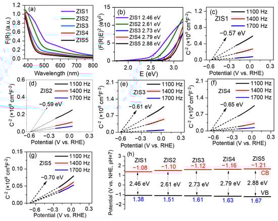 The flat-band potential (Efb) of the typical catalysts was further estimated by Mott–Schottky measurement. The Mott–Schottky curves indicated the samples exhibited n-type characteristics due to the positive slopes, and their flat-band potential was estimated to be −0.57, −0.59, −0.61, −0.65, −0.70 V vs. reversible hydrogen electrode (RHE), respectively (Figure 4c–g). The corresponding normal hydron electrode (NHE) potentials were calculated as −0.98, −1.00, −1.02, −1.06, −1.11 V vs. NHE. It has been reported that the conduction band minimum (CBM) of semiconductors is usually 0.1–0.2 V negative than the Efb [33]. In this study, the CBMs of ZIS1, ZIS2, ZIS3, ZIS4, and ZIS5 were −1.08, −1.10, −1.12, −1.16, −1.21 V vs. NHE, respectively. According to Eg = EVB − ECB, the EVB of ZIS1, ZIS2, ZIS3, ZIS4, and ZIS5 were 1.38, 1.51, 1.61, 1.63, and 1.67 V vs. NHE (shown in Figure 4h), respectively. These results and trends are consistent with previous reports [25,26].