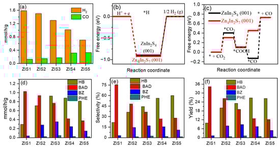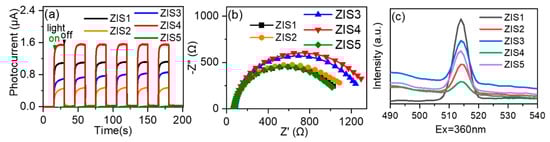 The charge transfer behaviors are an important factor to explain the photocatalytic activity [19,34,35]. Photocurrent measurement was employed to assess the separation efficiency of photogenerated charge carries. As shown in Figure 5a, it is clear that the photocurrent increased sharply when the light was turned on and immediately returned to its initial negligible value when the light was switched off. ZIS4 exhibited the highest photocurrent, followed by ZIS1, ZIS3, ZIS2, and ZIS5 under light irradiation. Further, electrochemical impedance spectroscopy (EIS) was performed to study the charge transfer resistance of the typical photocatalysts [36,37]. From Figure 5b, it can be seen that ZIS1 has the smallest radii of the semicircles (nearly equal to ZIS5), implying that ZIS1 is beneficial for charge transfer. Photoluminescence (PL) spectra were also applied to investigate the transfer of photogenerated charge carriers [38,39]. In Figure 5c, ZIS4 exhibited the lowest PL intensity compared with other ZIS samples, meaning the ZIS4 had the lowest recommendation efficiency of electrons and holes; this was consistent with the photocurrent testing result. It can be inferred from the subsequent activity results that the product selectivity of both CO2 reduction and BA oxidation was not directly related to the BET-specific surface area and charge separation efficiency, which can be affected by various facets, including active sites, defects, composition, morphology, etc. [25].