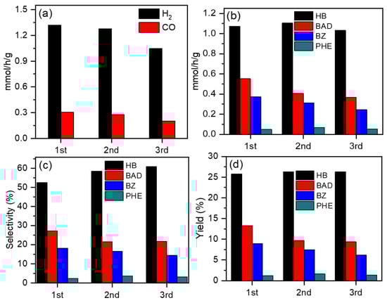 To evaluate the stability of ZIS, ZIS4 was selected as the typical catalyst for testing. The catalytic stability of the ZIS4 sample was assessed through photocatalytic reusability analysis for three cycles, as shown in Figure 7. Figure 7a demonstrates that the H2 evolution rates were 1.31, 1.28, and 1.05 mmol/g/h in the 1st, 2nd, and 3rd runs, respectively. The generation rate of CO was 0.30, 0.27, and 0.21 mmol/g/h in the 1st, 2nd, and 3rd runs, respectively. The corresponding liquid products are displayed in Figure 7b. The formation rate of HB and PHE did not significantly decrease, while the generation rate of BAD and BZ slightly decreased. Figure 7c,d reveals that even after three cycles, the selectivity and yield of liquid products remained close to those of the first cycle. Furthermore, XRD profiles and SEM images (Figures S7 and S8) of ZIS4 before and after long-time experiments confirmed the well-maintained crystalline phase and morphology. The preservation of the crystalline structure and negligible loss of gas and liquid generation rates over three runs indicate the durability of the ZIS4 sample, making it a promising candidate for potential applications in sustainable energy conversion.