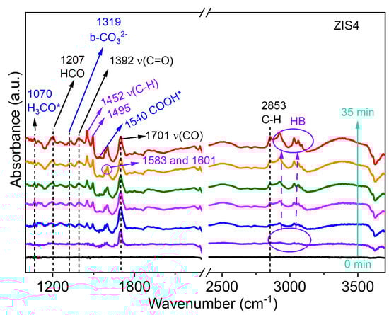 Furthermore, the photocatalytic CO2RR and BA oxidation catalyzed by the ZIS4 catalyst at room temperature were investigated using in situ diffuse reflectance infrared Fourier transform spectroscopy (DRIFTS). The corresponding data can be found in Figure 8. The reaction intermediates were determined by analyzing the observed peaks in the infrared spectra. The peaks at 1319 cm−1 were attributed to the presence of bidentate carbonate (b-CO32−) [3]. Additionally, the peaks at 1540 cm−1 were assigned to the COOH* group, which serves as an important intermediate for CO formation [3]. The infrared spectra also revealed the reaction intermediates involved in the conversion of BA. The peak at 1207 cm−1 was assigned to the presence of the formyl group (HCO) in BAD, while the sharp peak at 1701 cm−1 was attributed to the vibration of the carbonyl (ν(CO)) stretch mode in BAD [40]. The stretching vibrations of C-H in BAD were found at 2853 cm−1. The peaks in the range of 2900 to 3130 cm−1, which gradually increased with reaction time, were assigned to HB, indicating the generation of more HB. The intense bands at 1452 and 1495 cm−1 were associated with aromatic δ(C-C) and ν(C−H) modes [40], which can be assigned to HB. Moreover, the peaks at 1583 cm−1 and 1601 cm−1 were attributed to the C=C skeleton vibration of mononuclear aromatic hydrocarbons, and the peak at 3062 cm−1 was assigned to C-H stretching vibration on the benzene ring of HB. These findings provide valuable information on the reaction mechanism and intermediates involved in the photocatalytic coupled system of CO2 reduction and benzyl alcohol oxidation over the ZIS catalysts.