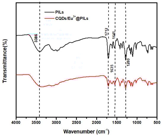 To illustrate the bonding mode and surface functional groups of CQDs-PILs-Eu3+, the FT-IR spectra of PILs (black line) and CQDs-PILs-Eu3+ (red line) are given in Figure 2. The results show CQDs-PILs-Eu3+ with -OH, C=O, C-O and C-N stretching vibration peaks, indicating that the samples contained amino, carboxyl, and imidazole rings [25]. The characteristic vibration peak of carboxylate group appeared at 1712 cm−1, 1641 cm−1, and 1280 cm−1 in PILs infrared spectrum, and the stretching vibration of O-H appeared at 3386 cm−1, which proved the existence of carboxylate group on the surface of PILs prepared. Furthermore, the stretching vibration peak attributed to C=O shifted from 1720 cm−1 to 1712 cm−1, while the characteristic peak of the amide bond appeared at 1635 cm−1 in CQDs-PIL-Eu3+, which confirmed the successful binding of CQDs and Eu3+ to PIL [26,27]. In the spectrum of CQDs-PILs-Eu3+, the characteristic peak of amide appeared at 1635 cm−1, indicating that the amino group on the surface of CQDs and the carboxyl group on the surface of PILs were successfully amidezed and combined. By comparing the infrared spectra of PILs and CQDs-PILs-Eu3+, we found that the vibration peak of the carbonyl group was slightly blue shift, indicating that Eu3+ successfully chelated to the functional groups on the surface of PILs.