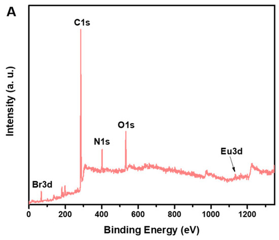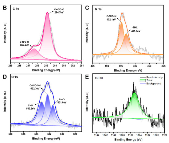 In order to further analyze the elemental composition and functional groups of CQDs−PIL−Eu3+, the X-ray photoelectron spectroscopy (XPS) was performed in Figure 3A. The characteristic peaks of Br3d, C1s, N1s, O1s, and Eu3d appear at 67.83 eV, 284.81 eV, 401.75 eV, 532.3 eV, and 1134.94 eV, respectively. The results showed that the sample CQDs-PIL-Eu3+ was composed of bromine, carbon, nitrogen, oxygen, and europium, with the element contents of 1.88%, 79.65%, 8.9%, 8.91%, and 0.66%, respectively, which further confirmed that CQDs and Eu3+ were successfully bonded to PIL. In addition, high-resolution XPS spectrum revealed that C1s in CQDs-PIL-Eu3+ exists in the form of C-C/C=C (284.7 eV) and C-N/C-O (286.4 eV) (Figure 3B) [28], N1s in C-N/C=N (402.1 eV), and -NH2 (401.6 eV) (Figure 3C) [29], while O1s in C=O (533.2 eV), C-O/C-OH (532.3 eV), and O-Eu groups (531.6 eV), respectively (Figure 3D) [30]. Secondly, the fine spectra of Eu3d further affirmed the successful chelation of Eu3+ (Figure 3E).
