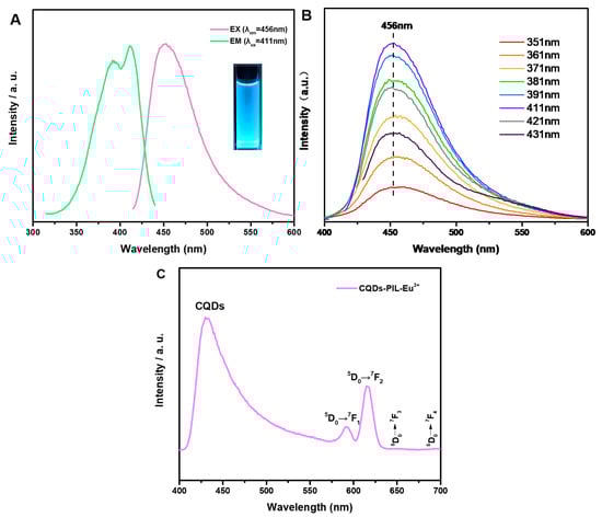 The fluorescence properties of excitation and emission spectra of CQDs are shown in Figure 4A, its optimal excitation and emission wavelengths were 411 nm and 456 nm, respectively, showing characteristic emission of blue light. Meanwhile, it displayed a bright blue fluorescence (Figure 4A illustration) under a 365 nm UV lamp, and the actual results were consistent with the theory. However, in contrast to general reports, CQDs synthesized by this method showed non-excitation dependence (Figure 4B), that is, with the increase in excitation wavelength (351–431 nm), the relative fluorescence intensity of the emission spectrum was first increased and then decreased, but the location of the optimal emission peak did not change [24]. Subsequently, Figure 4C reveals that the luminescence excitation and emission spectra of CQDS-PIL-Eu3+ were studied at room temperature when excited at 298 nm. Four narrow characteristic emission spectra exhibited the 4f→4f transitions of Eu3+ (5D0→7FJ, J = 1, 2, 3, 4), which were located at 594, 616, 653, and 695 nm, respectively. The most intense emission peak at 616 nm was ascribed to 5D0→7F2 transition, and it induced the red emissions. In addition, a characteristic emission of CQDs appeared at 440 nm, and the position of emission peak was slightly offset compared with pure CQDs, which again confirmed the successful combination of CQDs and PIL.