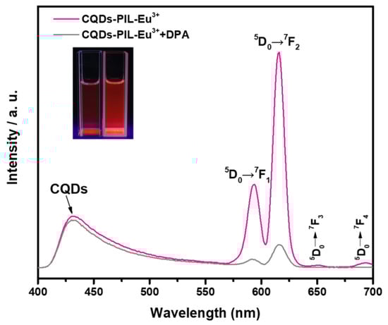The emission spectra of CQDs–PIL–Eu3+ before and after dropping DPA.