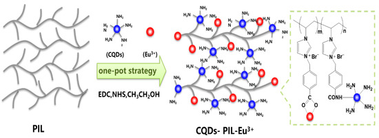 The synthesis route is shown in Scheme 1. An amount of 0.15 g PIL was dissolved in 10 mL anhydrous ethanol in a 50 mL flask and dispersed evenly by ultrasound, then stirred on an ice bath. And 0.048 g EDC and 0.023 g NHS were added, respectively, stirred for 1 h, and removed from the ice bath. Then, 3 mg CQDs was suspended in 3 mL PBS buffer solution (pH = 7.4), and 0.092 g EuCl3·6H2O was weighed. The mixture was then added together to the flask and stirred at room temperature for 24 h. After the reaction was completed, the supernatant was removed by centrifugation, the precipitate was collected and washed with anhydrous ethanol for several times to remove the remaining impurities. The solid product CQDS-PIL-Eu3+ was finally obtained after 24 h of drying in a 65 °C oven.