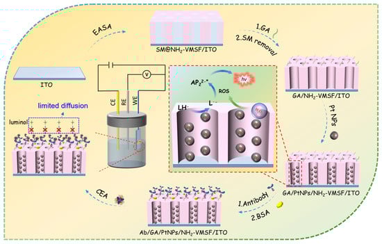 In this study, an ECL immunosensing platform for the highly sensitive detection of CEA was constructed by functionalizing nanochannels and the outer surface of VMSF. Amino-functionalized VMSF (NH2-VMSF) was rapidly grown on an inexpensive and readily available indium tin oxide (ITO) electrode using an electrochemically assisted self-assembly method (EASA). The amino groups inside the nanochannels served as anchoring sites for the in situ electrodeposition of the platinum nanoparticles (PtNPs) via one-step electrodeposition, while the amino groups on the outer surface were applied for the covalent immobilization of recognition antibodies after aldehyde derivatization, forming an immunorecognition interface. Due to the catalytic activity of PtNPs in decomposing H2O2 to generate ROS, the ECL signal of the luminol–H2O2 system was significantly enhanced and exhibited high stability. When CEA was present, its binding on the immunorecognition interface formed large-sized immunocomplexes, which hindered the diffusion of the luminescent species and co-reactant to the underlying electrode surface, resulting in a decrease in the ECL signal. Based on the signal-gating effect induced by the immunorecognition, the detection of CEA with high sensitivity could be achieved.