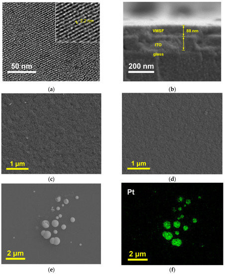 (a) Top-view TEM image of NH2-VMSF. Inset is the high-resolution TEM image. (b) Cross-sectional SEM image of NH2-VMSF/ITO. (c,d) Top-view of SEM image of NH2-VMSF/ITO (c) and PtNPs@NH2-VMSF/ITO (d). (e,f) SEM image (e) and elemental mapping (f) of the electrode obtained after NH2-VMSF on PtNPs@NH2-VMSF/ITO was removed by dissolution with NaOH solution.
